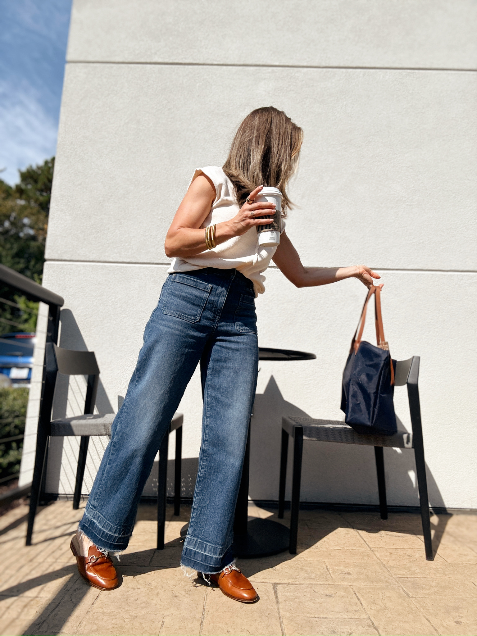 Cropped wide-leg jeans are a bit different than full-length jeans, which means you need to style them differently. The hem hits above your ankle bone, which means your ankle and foot will show, so your shoe choice is more important. Since these won’t go all the way to the floor, they will not work to elongate your legs in the same way as a full-length pair, but they allow for your shoe choice to add interest to your outfit. I like to wear sandals, loafers, kitten heels, and even sneakers with cropped wide-leg jeans. Cropped jeans tend to feel more casual and laid back.